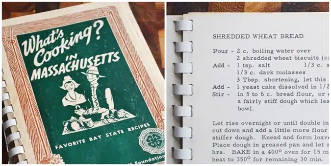 For vintage recipe inspiration, I often turn to my own cookbook collection. I love nothing more than the spiral-bound community cookbooks prevalent at thrift stores and library book sales, and when I see a golden example from New England, I can’t help myself (space on the bookshelf be darned). This one, What’s Cooking in Massachusetts: Favorite Bay State Recipes compiled by the Massachusetts 4-H Foundation, appears to be from the 1960s, and beyond the Shredded Wheat Bread, it includes recipes for regional favorites like Copley Plaza Relish, Fish Chowder, Boiled Dinner, and Boston Cream Pie detailed with whimsical hand-drawn illustrations.