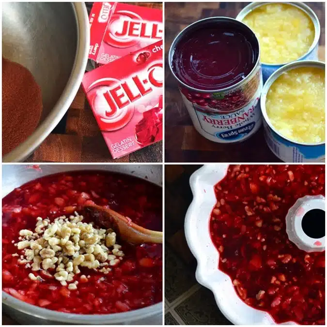 There is a mold that my Mother made and now I make and it’s very similar but instead of pineapple, you add 1/2 cup of finely chopped celery and 2 peeled, finely chopped apples to the black cherry jello, whole berry cranberry sauce and walnuts. It sounds weird but it’s really good!