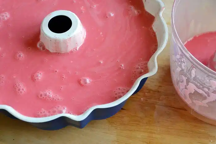 Having a tough time getting the mold to release from the pan after several hours filled upside down over a plate, I used a butter knife to gently loosen the sides. When that didn’t work, I hunted online for advice on how to un-mold Jell-O and read that it helps to partially immerse the mold in a bowl of warm water for 60 seconds. I kept it to 15 seconds, but either the water was too warm or the metal pan absorbed the heat too quickly because when I next tried to invert the mold it splashed and splattered out in a terrific pink explosion.