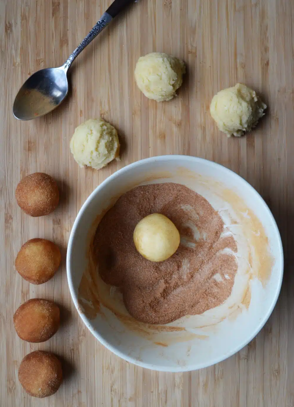 While the dough is mixing, combine 2 tablespoons of sugar with 2-3 teaspoons of cinnamon in a bowl and stir until it’s well blended. Then, break off pieces of the dough (a cookie scoop will ensure they’re all the same size), roll the pieces between your palms to form 1-inch balls, and coat the balls in the cinnamon and sugar.