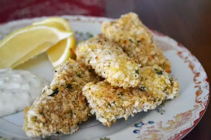 Baked homemade fish sticks with tartar sauce and lemon wedges. Photo Credit: Aimee Seavey