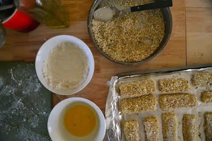 The fish gets dredged in the flour, then dipped in the beaten egg, then pressed into the crumbs for an even coating. It’s a messy process, so I like to stick several “floured and egged” strips at a time into the crumbs, wash my hands, then use a spoon to give them a light coating before pressing the fish down with my fingers into the crumbs to make sure it really sticks.