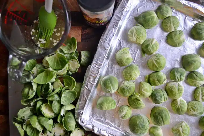 After removing the stem of each sprout and slicing the sprout in half, the outer leaves are prone to falling off like late-summer rose petals. Some people love the way the delicate curls char in the oven, but I make a valiant effort to keep the charred leaves to a minimum by arranging the sprouts (cut-side down) onto a lightly oiled and lined baking sheet before gently basting them with my marinade with a silicone pastry brush. If you’re a fan of the charred leaves, toss the sprouts in the marinade in a bowl and encourage more of them to wiggle loose during the toss process.