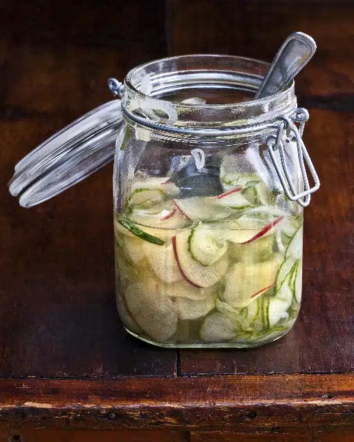 Note: To make this pickle truly pretty, the mandoline and biscuit cutter are essential. The mandoline because you want paper-thin slices, and the biscuit cutter so you can create apple slices that are the same size as the cukes. You don’t need anything fancy, though.
