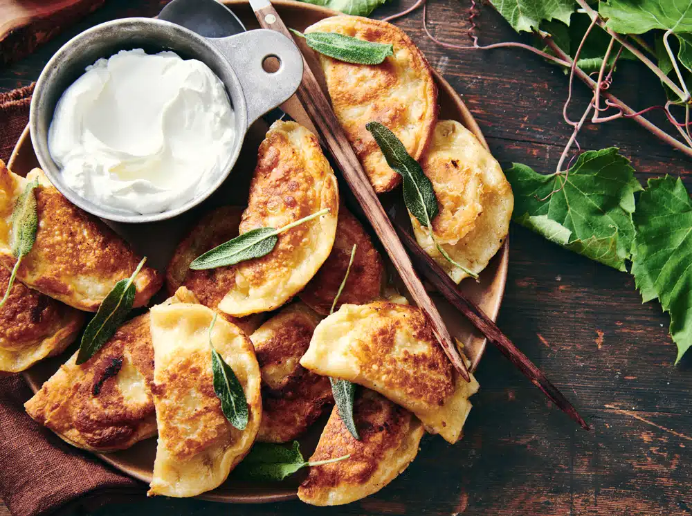 Serve the pierogi with the sage leaves sprinkled over the top and sour cream on the side.