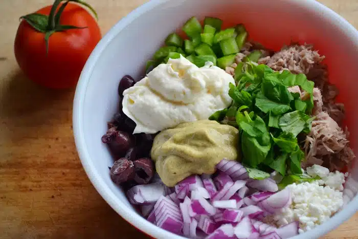 Kind of like a tuna fish salad on steroids, tuna bean salad pairs chunk tuna (oil-packed will give a lot more flavor) with cannellini beans (or garbanzo, if you prefer) for a heartier bite. I like to spin it in a Mediterranean direction, adding tangy feta cheese, salty Kalamata olives, and red onion to the mix along with some celery for crunch. A little mayo, Dijon mustard, chopped fresh basil, and seasonings to taste rounds it all out, but feel free to use whatever herbs you prefer or have on hand.