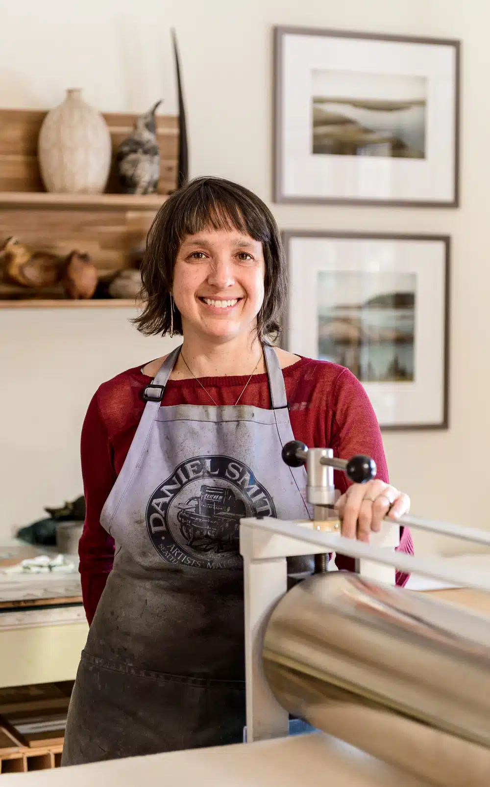 When her husband, Lance, got that most-Maine-of-all jobs—as a boatbuilder at Lyman-Morse Boatbuilding—the New England native finally came home. She bought a press and set it up in Boothbay Harbor, then moved it to Thomaston when the couple settled there. For a brief time, she even relocated the press outside the house, seeking serenity. “I found a little studio—I was there six months,” she says ruefully. “But I missed everyone.” When the family moved into their Rockport home in 2016, the 400-pound press came home, too. And stayed. “My husband says I’ve officially used up the press moves!”