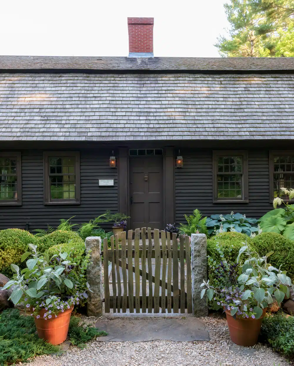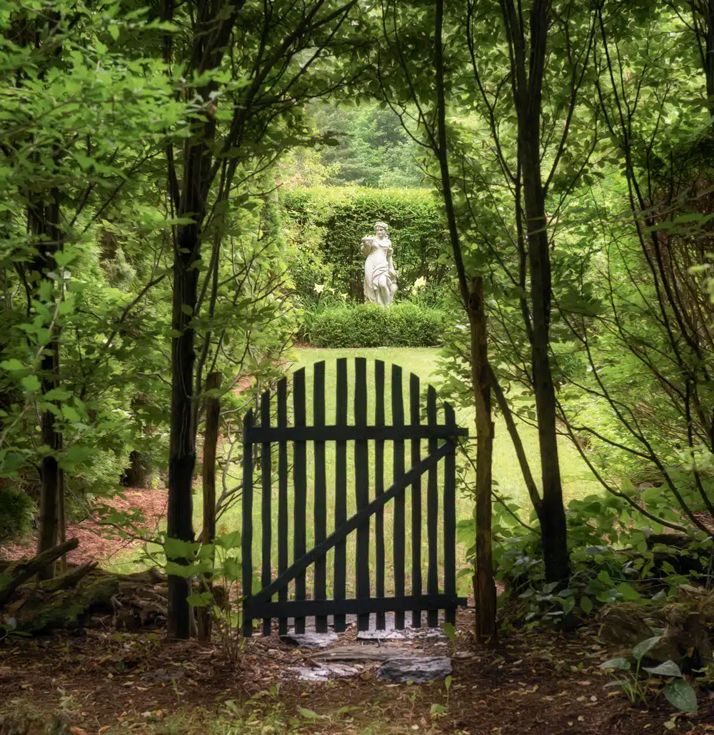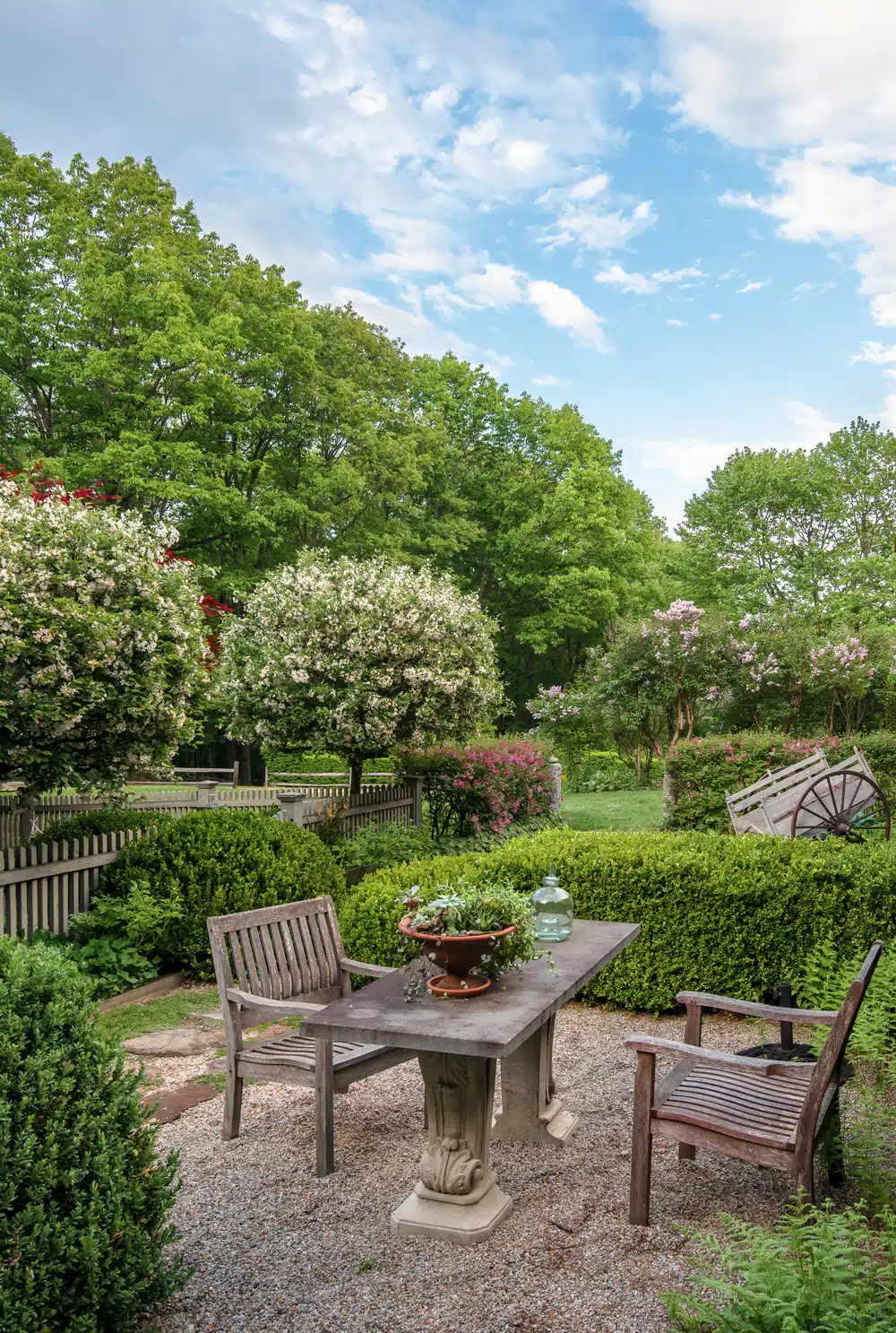 We move on to the pergola, swathed in chocolate vine, a fast grower that’s covered with deep-burgundy flowers in the spring. Crushed-stone pathways ebb and flow in all directions, and I glimpse more of Joe’s handiwork: a barn-red garden gate, and another in a brilliant shade of periwinkle. Here is where deep artistry comes in—making sure that transitions work in every direction. I covet a small antique stone owl, worn by weather, perched on a granite post.