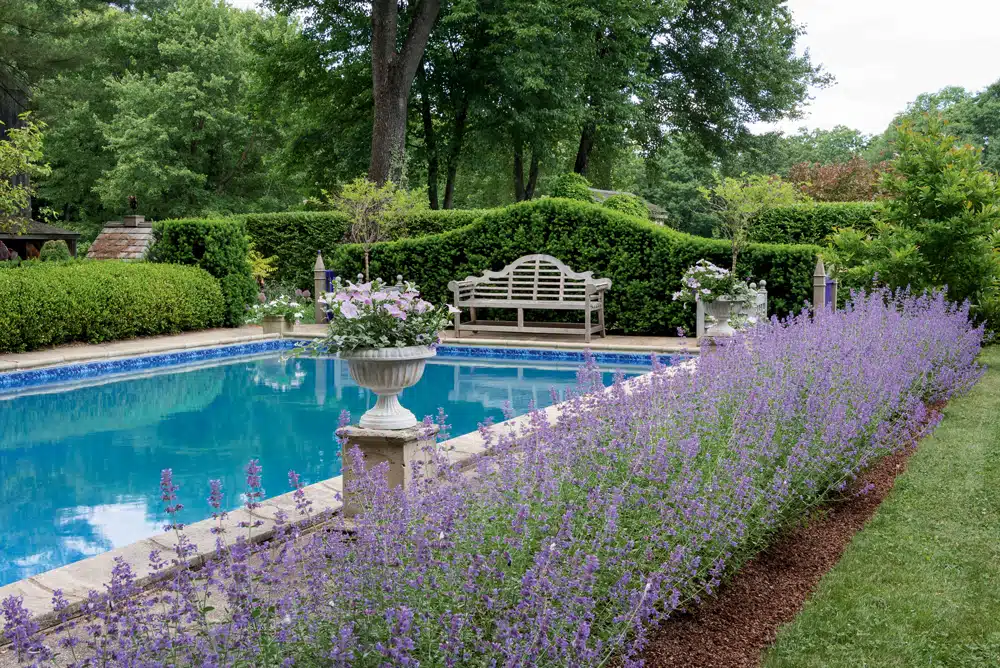There is no hint of the 30-year-old pool until we round a corner. Sheltered and serene, it is cloaked by a boxwood hedge, planted to shield its bright blueness from the house. “The pool was here well before we came,” says Paula, who likes to swim in the evening. “It’s held up nicely.” The perimeter is edged with graying teak benches and tables festooned with red umbrellas. Planters made of hypertufa (a composite concrete mix) spill over with rosy Supertunias. At one end, Joe has built a tiny pool house “folly,” modeled after the gazebos at Hidcote Manor Garden in England. “We copied the measurements and roof style,” he says, nodding toward the swooping, pointed top. “There’s a guy in town who helped me—the roof was a bit above my pay grade,” he admits with a grin.