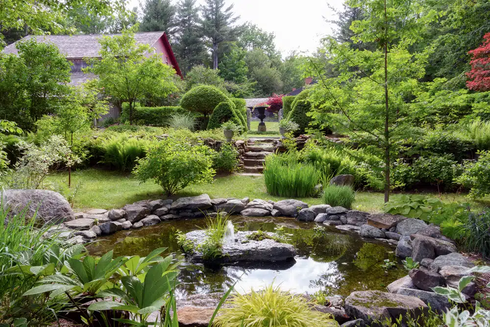 And there’s another little building that Joe completed the day before their last Garden Conservancy Tour. “It’s a replica of Prince Charles’s temple at Highgrove House—the one in his woodland garden,” he says. “You can’t take photos when you’re there, so I kind of figured out the dimensions by looking at photos.” We survey the rustic columns, the tangle of juniper branches decorating the peak, the view to the stone-ringed pond. “He’s got a much more beautiful bench inside,” Joe says. “Probably the King of Tibet gave it to him,” Paula remarks. With its weathered grace, I’ll take Joe’s temple any day. It seems the perfect place to sit and ponder it all, to reflect back on the early days, on that first small garden.
