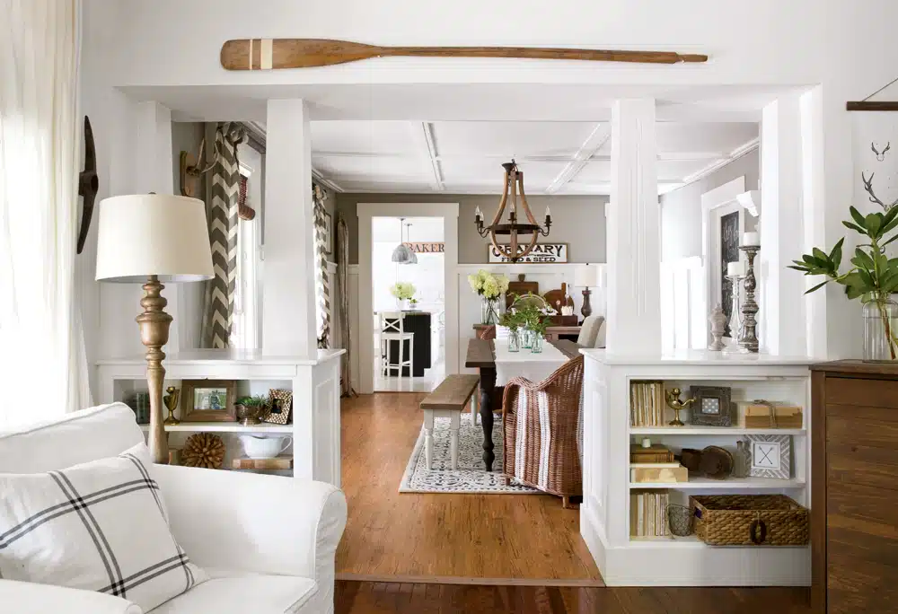 Bre indicates the half walls topped with columns that divide the dining and living rooms. “This was the selling point for me,” she says. The feeling of open space, the uncluttered style … it’s an oasis of calm. “Weathered wood, white, and anything slipcovered—it’s what I’m known for.”