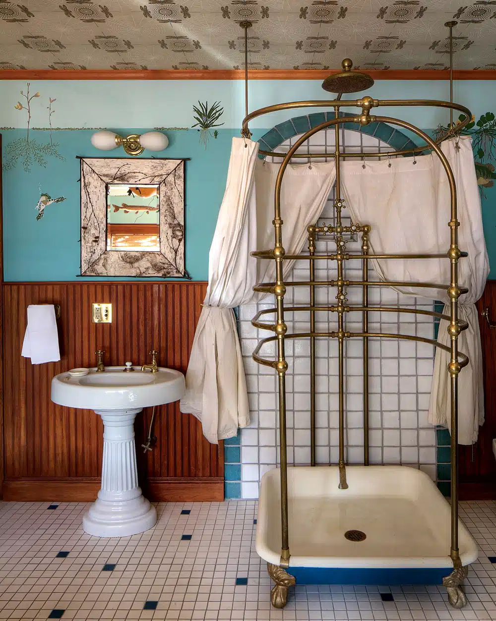 A bathroom featuring a Victorian cage shower and a mural by Goodrich.