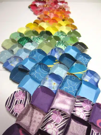 - Decide which color paper scraps you would like to work with. I had so many colors to choose from that I decided to do a rainbow theme, but you can create this project using one color or many. Also, if you do not save your paper scraps like I do, you can go through magazines, scrapbook papers, and junk mail to make an instant collection.