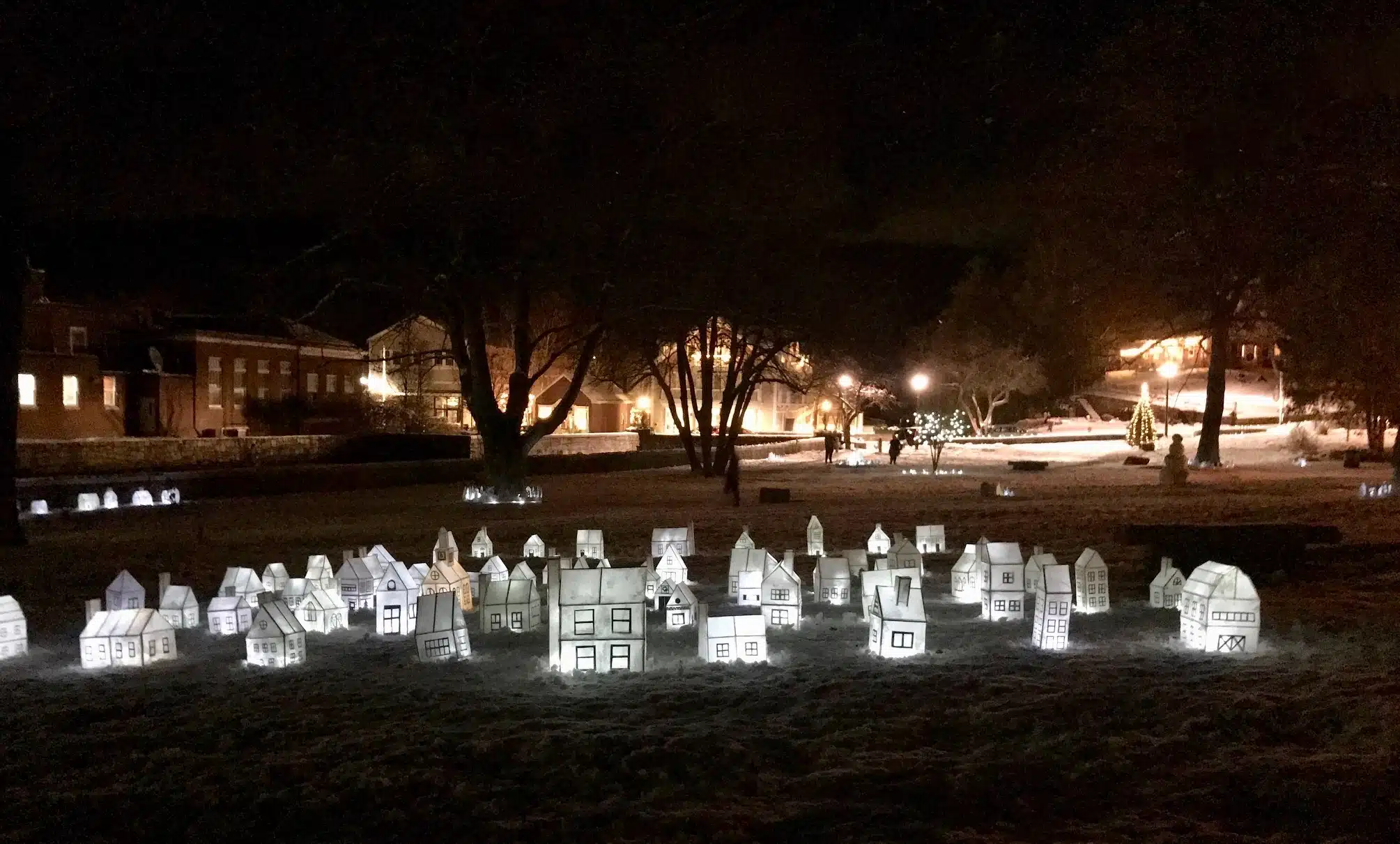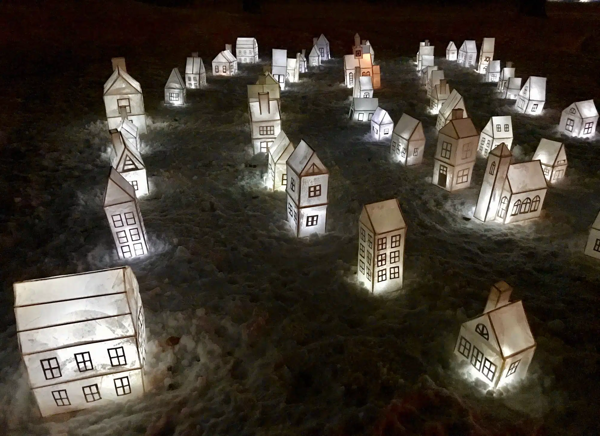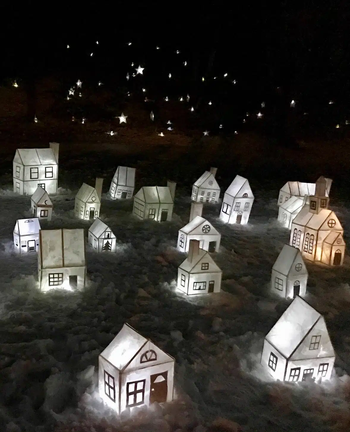 The garage filled with scrap wood, coffee filters, glue, papier-mâché, corrugated plastic, and cardboard, and day by day the lantern village emerged: cottages with doors and windows and even tiny pets inside. In their own quiet, head-down way, this group of people was saying, Here is what we can still do. We can make beauty in the midst of darkness, we can make everyone feel a little less alone, we can make a village of lights grow in a little park, a Christmas miracle if ever there was one.