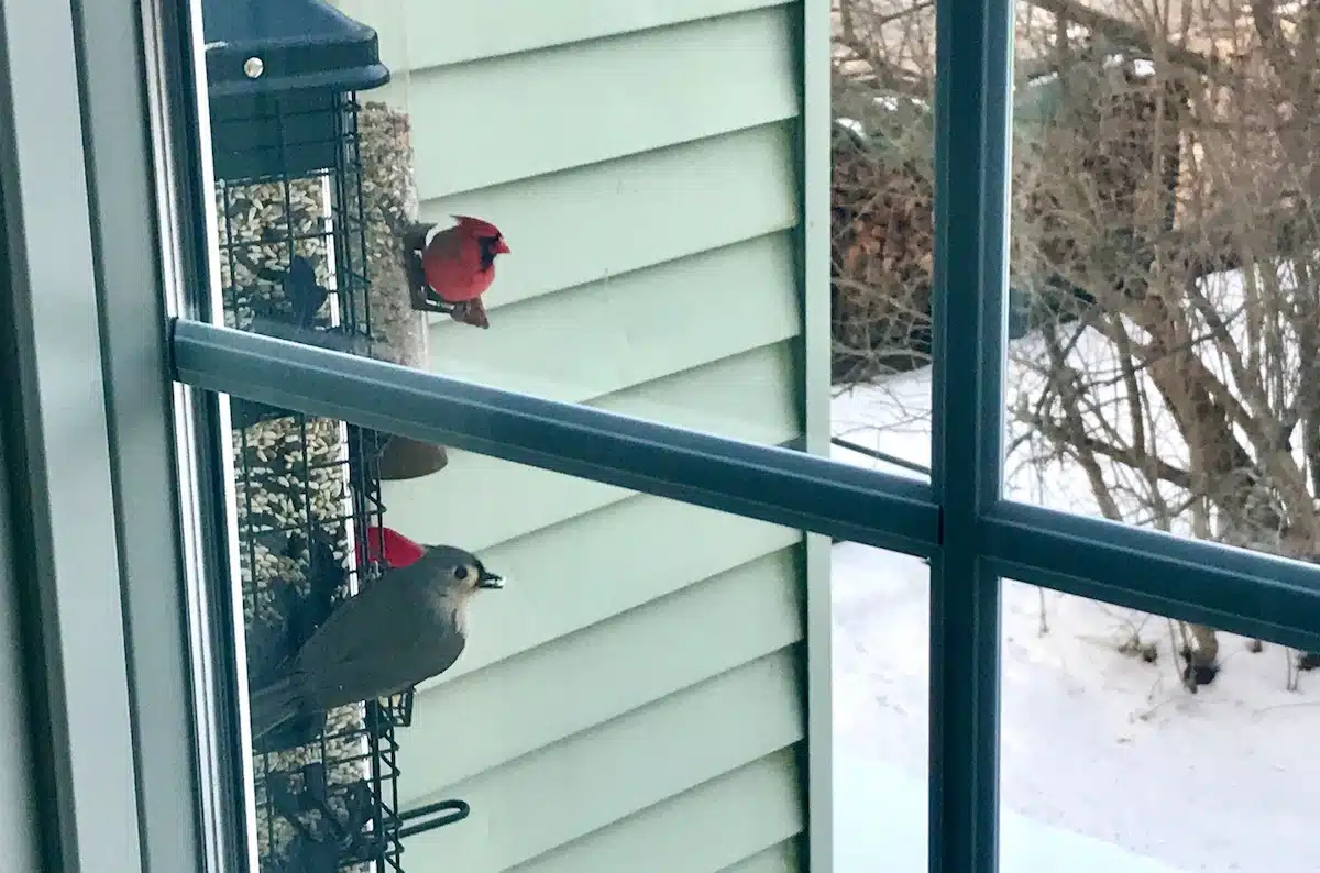 The best Christmas gift that Annie and I gave each other is the show that begins every morning outside the windows facing the river, and does not end until just before dark. Two birdfeeders filled with seeds, and a third with suet, have convinced every cardinal, blue jay, nuthatch, tufted titmouse, chickadee, woodpecker, and others (whose names I am still searching for) that this is the neighborhood takeout banquet. They have become the loveliest scenery imaginable.