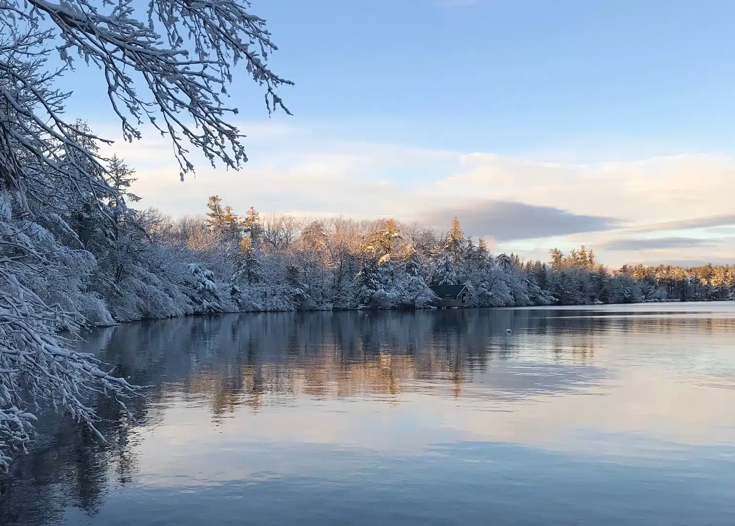 Sunday morning I shoveled the driveway, and the wet snow made it feel much deeper than it was. Every shovelful I carried from sidewalk to the wall by the garage, where I sent it thudding to the yard below, seemed heavier than the last. In the afternoon we drove to Dublin and walked Rudy around the lake where we had enjoyed so many swims last summer. The trees along the shore shimmered in the sun, and the lake was calm. In summer, cars often lined both sides of the road, but now we were alone and it was quiet, broken only by Rudy’s barking to alert us that workers had arrived in a utility truck and were eyeing bent trees branches near some power lines. In the subdued winter light, it was like seeing a different lake.