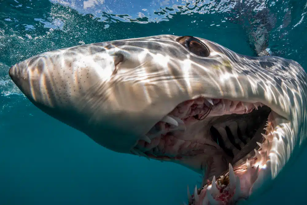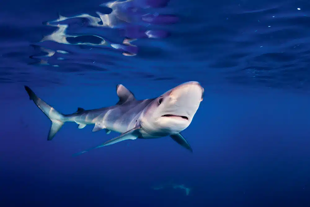 While Skerry has photographed many sharks during his career, it was a blue shark (like the one shown below) that provided him with his most memorable encounter. As he told Scuba Diving Magazine: “We were inside a cage for hours, with no sightings. Late in the afternoon, a female blue came along and I was so excited I thought I might explode. Without really thinking, I opened the cage door and swam out … back then, no one was going outside the cage. I vividly remember them telling me [afterward] I was crazy. I swam towards the shark as she nosed her way through the slick, looking for morsels of chum. I made a few frames before she swam away. To this day, I can remember that feeling of elation. For days I was walking on air recalling this special experience; it was like I knew a secret that no one else knew. I was instantly addicted.”