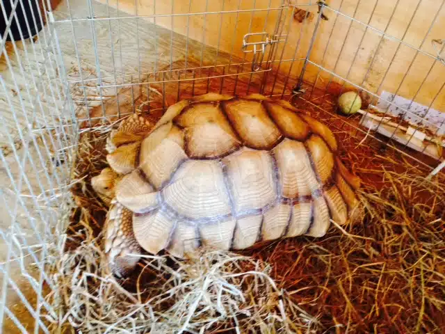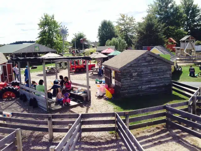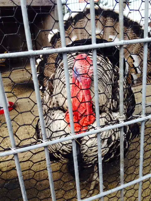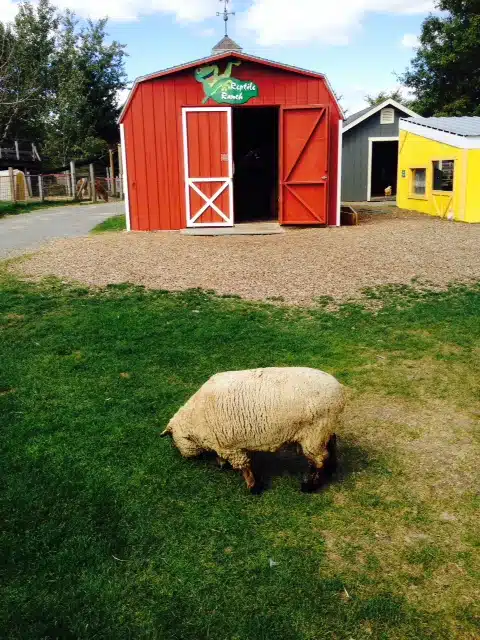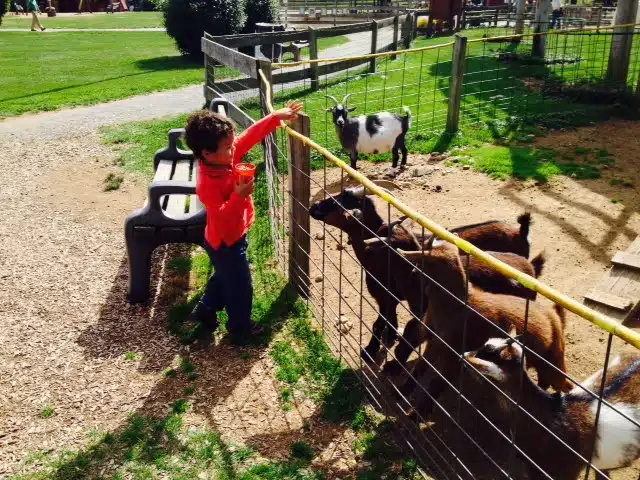 The welcome area at the farm’s petting zoo. Photo Credit : Ian AldrichShelby, a 25-year-old African Spur Tortoise, was a big hit with my son. Photo Credit : Ian AldrichA tractor ride with Farmer Jack gives visitors a unique look at the farm. Photo Credit : Ian AldrichFeeding the friendly goats proved a little daunting to my son. Photo Credit : Ian AldrichYep, we got to pet cows. Several times. Photo Credit : Ian AldrichMy son wanted to give this sheep a big hug. The sheep was not quite as excited as he was about this. Photo Credit : Ian AldrichThere are signs instructing visitors not to stick their fingers in the turkey cages. I can see why. Photo Credit : Ian AldrichSee the names? Who says farmers don’t have a good sense of humor? Photo Credit : Ian AldrichFor parents, the playground comes with an important feature: benches. After hours of wandering the farm, it’s nice to take a seat. Photo Credit : Ian Aldrich
