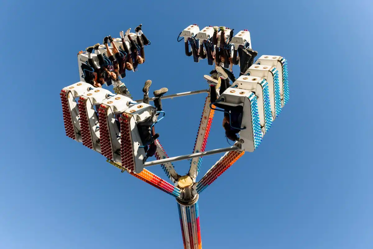 Early morning at the midway. “This is a very cool time to be at the fair, with everything still ‘asleep,’” Fleming says. “There’s an almost eerie feeling, walking around the midway when it is dead quiet.” Photo Credit: Mark FlemingEmpty fair parking lot. “I love the light on this shot, and the symmetry with the pole,” Fleming says. Photo Credit: Mark FlemingTractor being loaded with hay for livestock in the early morning hours. Photo Credit: Mark FlemingSheep await the attentions of young fair goers. Photo Credit: Mark FlemingCathy Hill from CJ’s Ranch in West Barnstable, Massachusetts, warms up her horse Bridger in the indoor arena. Photo Credit: Mark FlemingAfternoon light filters into the arena during the tractor pulls. Photo Credit: Mark FlemingParticipants line up for the antique farm tractor pull. Photo Credit: Mark FlemingPrize cattle get a bath before a long day at the fair. Photo Credit: Mark FlemingA group of Hereford cattle rests in the cattle barn. Photo Credit: Mark FlemingCleaning the arena before the days events begin. Photo Credit: Mark FlemingThe Barnstable Barn Burners, an equestrian drill team, preps for their afternoon show. Photo Credit: Mark FlemingThe classic red uniform of the Royal Canadian Mounted Police hangs in the barn before horse and rider take the “stage” in the main arena. Photo Credit: Mark FlemingThrill-seeking fairgoers enjoy flying high in the air. Photo Credit: Mark FlemingUp close with the animals at the Topsfield Fair. Photo Credit: Mark FlemingDelicious and warm apple desserts from Learned’s. Photo Credit: Mark FlemingChildren enjoy the steep and rolling slide. Photo Credit: Mark Fleming