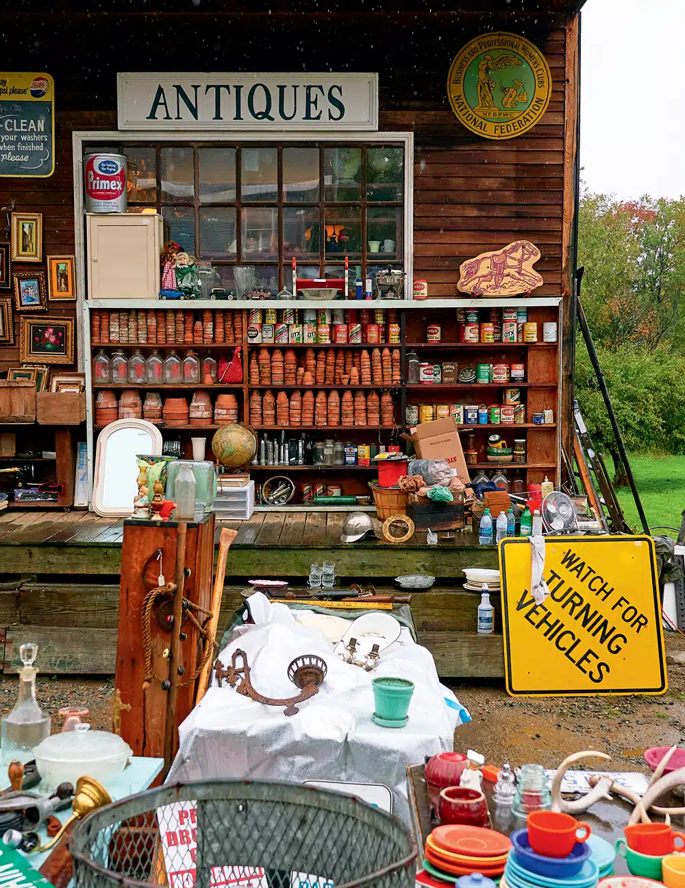 A soggy morning has given way to a soggy afternoon by the time we roll through Bethlehem, New Hampshire, a small town in the western White Mountains that’s known for its antiques shops. Mark and I are on our way to Littleton for pizza and some Belgians at Schilling Beer Company, but our dinner plans get postponed when we see Hundred Acre Wood, a self-described showcase of “antiques and fun junk” that spills out of two barns on Bethlehem’s Main Street.
