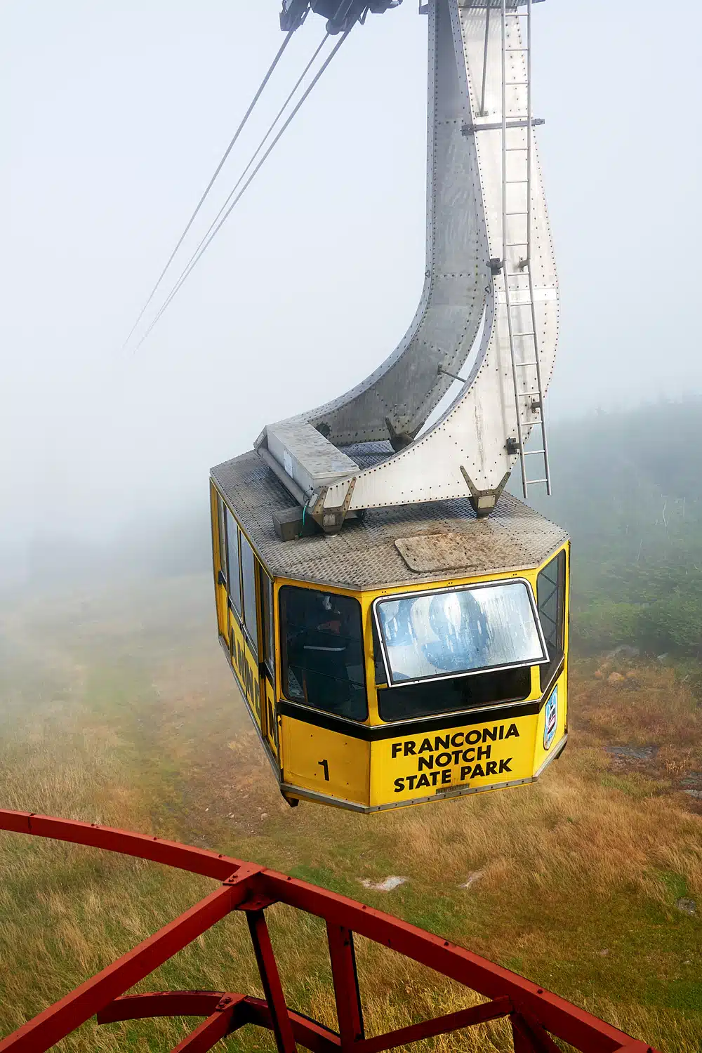 Farther north, we get a dramatic gain in elevation on the Cannon Aerial Tram, which has hauled tourists to the top of its namesake mountain since 1938. The seven-minute ride takes us to a cloud-soaked peak, and photographer Mark shakes his head with disappointment. There is color out there somewhere, but nothing that we would see today. “Tomorrow,” I tell him. “Maybe tomorrow.” And then I check the forecast. Seventy percent chance of rain.