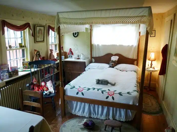 There’s a reason behind the “fairytale” part. While it’s a destination in its own right, Pickity Place is also known as the original visual inspiration for the “Grandmother’s House” in the Little Red Riding Hood story. It’s an association they enjoy, selling books and toys, showcasing the story, and staging an entire room with sleeping “Grandmother” in bed (sometimes with one of the two Pickity cats, Rosemary and Sage, snoozing on the pillow).
