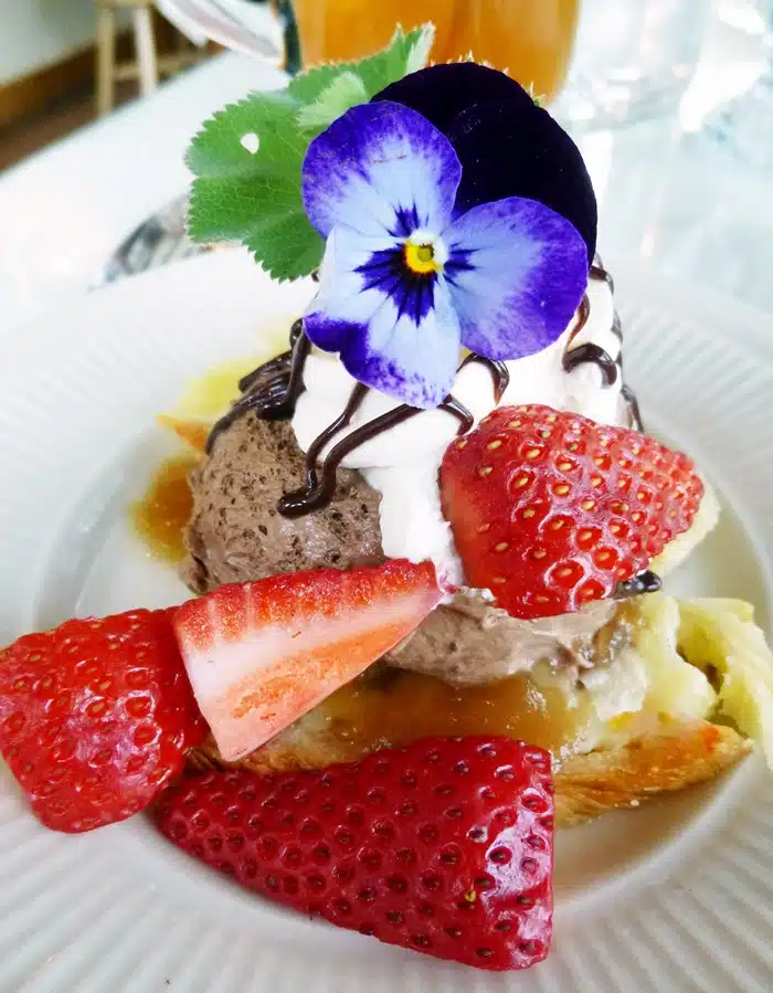 And for dessert, an artful presentation of Dutch chocolate mousse in sweet pastry with strawberries and whipped cream, garnished with lady’s mantle and another pretty pansy.