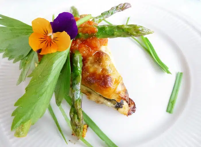The main course, which was also served with garlic bread and sun-dried tomato dipping oil, was a four-cheese ratatouille quiche topped with sautéed asparagus with citrus shallot butter and garnished with spring chives, lovage, and a fresh (edible) pansy.