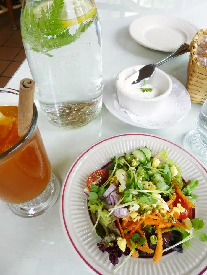 During my visit, I enjoyed vegetable dip on crackers, followed by a cup of creamy broccoli soup with smoked Gouda cheese, then a spring chopped vegetable salad. In the cooler months, I order the hot spiced mocha as my beverage, but in the spring and summer, the iced spiced tea (complete with a cinnamon stick) is wonderful.
