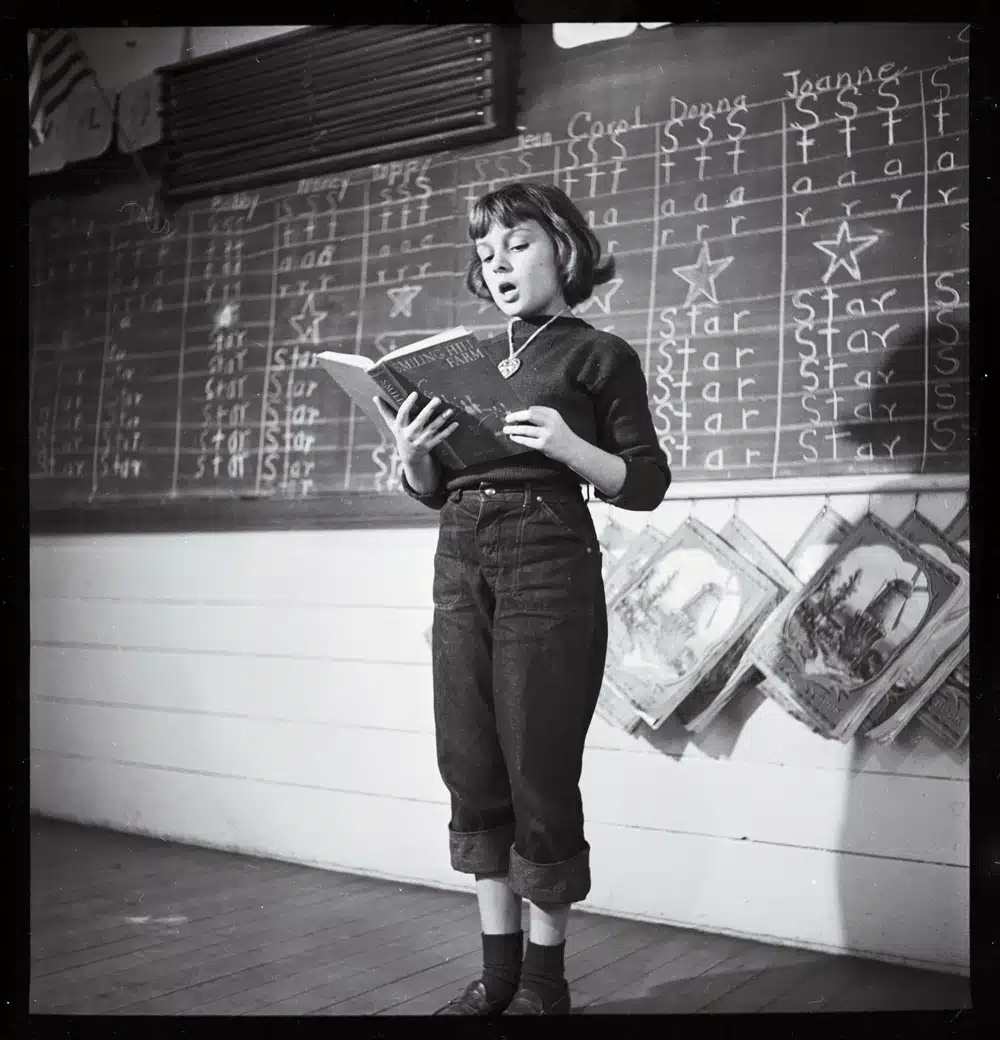 Many of Ruohomaa’s self-assignments centered on everyday life in midcoast Maine, such as this student reading aloud in a one-room schoolhouse in Rockville in 1950.