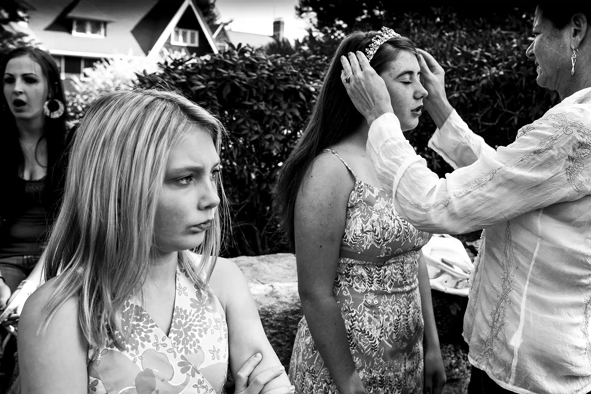 “Every April we have the Apple Blossom Festival. It has grown over the years as the town has doubled and tripled [in size]. Some of my photos from 1982 show five people standing watching … while now we have a sea of people. One of the highlights and a deep tradition is the high school–nominated contenders for Apple Blossom Queen. It is an honor and scholarship awarded by the Kiwanis Club. The girls wear long gowns and each rides in a convertible (often vintage) for about a mile through the center of town to a field where the awards are given. Very Americana! The girls usually gather at the top of the hill where all the convertibles park. In this particular photo, these are the younger sisters who are allowed to ride along. I will leave the interpretation up to you.”