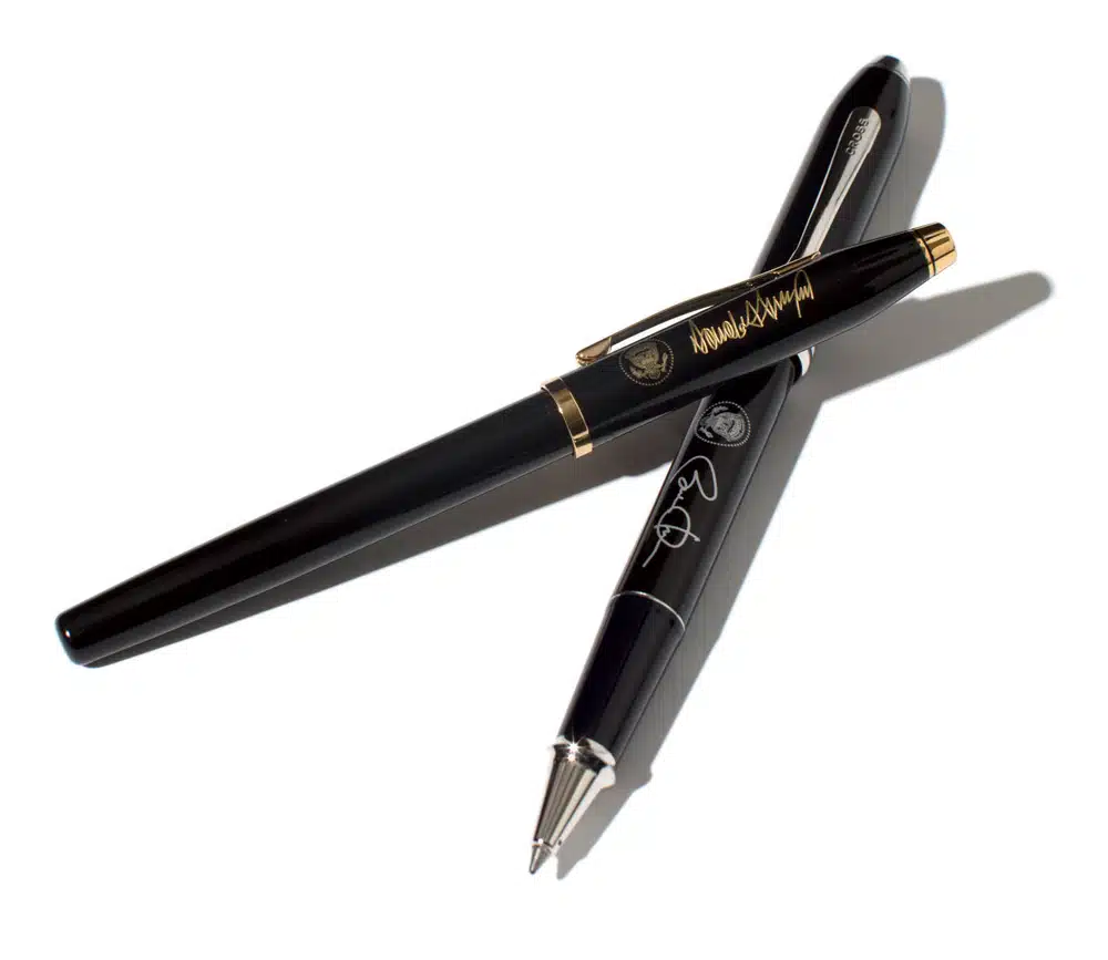 The firm has been supplying the official White House pen since the Clinton era, with the model and design elements tailored for each administration: For Trump, it’s a Century II in black lacquer with his signature rendered in, naturally, 23-karat gold. “Luckily we haven’t had too many issues yet fitting [the presidents’] signatures onto the pens,” says Andy Boss, North America sales manager for Cross (though Boss added that Obama did request his John Hancock be placed on the barrel of the pen, “which is not something we normally do”).