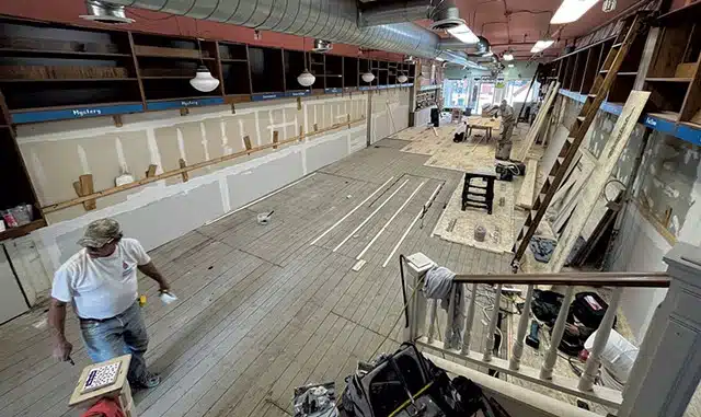 Like almost every downtown Montpelier storefront that was inundated in last month’s flood, Bear Pond Books is closed until further notice. Approximately 3,000 sodden books have been cleared out of the retail space near the corner of State and Main streets, along with piles of fixtures and furniture accrued over its 50-year life. On Monday a construction crew was hard at work installing a new floor and the bottom sections of the walls.